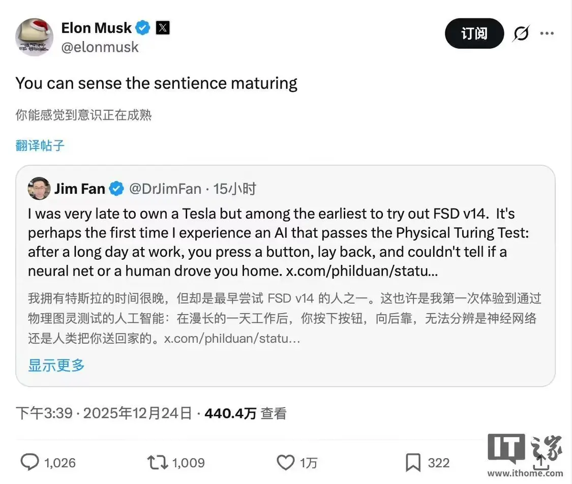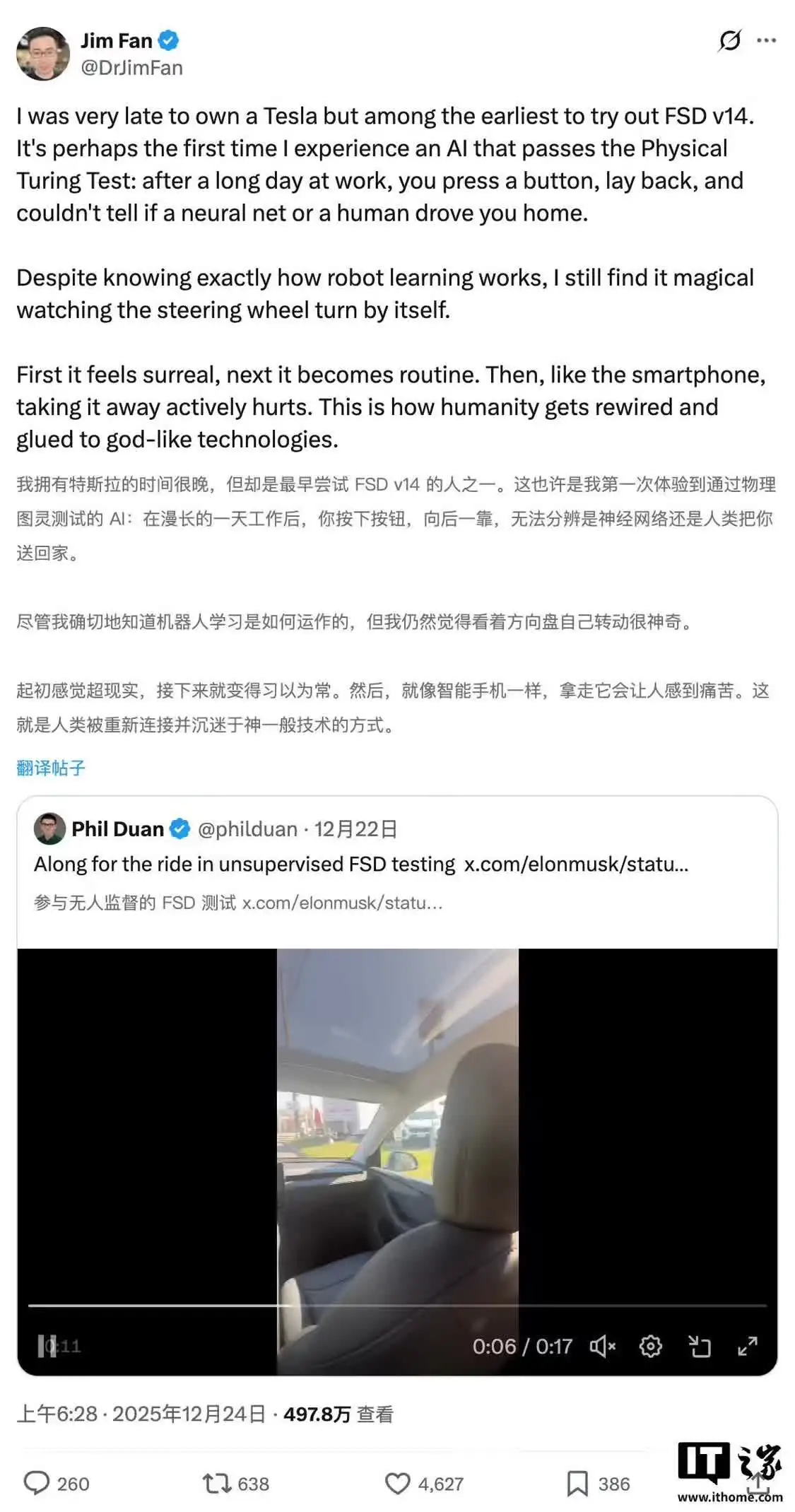 IT之家 12 月 24 日消息,今天清晨,英伟达机器人业务总监 Jim Fan 表示,特斯拉的 FSD v14(IT之家注:受监管的版本)首次让 AI 通过了他提出的“物理图灵测试”。