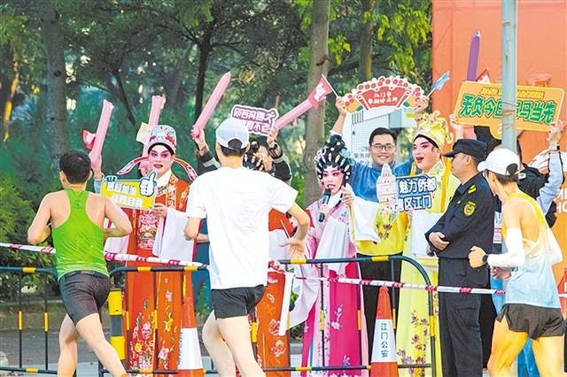 今年江马的跑道,被跑者们誉为一条“会唱歌、有故事”的风景线。组委会精心打造的“音乐赛道”,将27个氛围点化作27个流动的舞台。在体育路保利公寓转华盛路氛围点,江门市粤剧传习所的演员们一曲曲经典粤曲,婉转唱腔吸引不少选手放慢脚步拍照记录,吸引观众驻足聆听、沉醉其中。