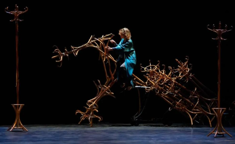 舞台上,一件寻常大衣被门勾住,顺势展开露背长裙上缀满珠宝,瞬间点亮了整个空间。 这是《钟声与魔咒》在上海YOUNG剧场演出的魔幻开场的一幕,也是查理卓别林艺术血脉在第三代