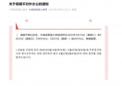 据中国驻韩国大使馆官方微信消息,根据节假日安排,中国驻韩国大使馆领侨处2026年2月14日(星期六)至2月22日(星期日)不对外办公,2月23日(星期一)起对外办公,敬请留意。 图源:中国