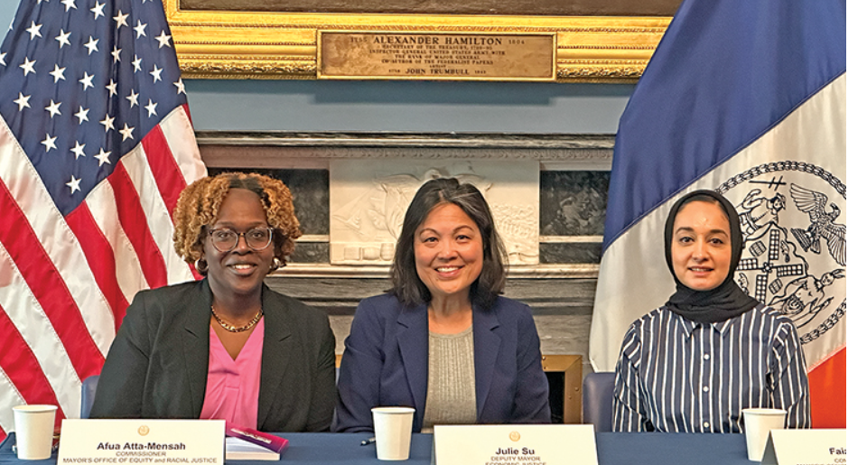 移民传统周之际,市经济正义副市长苏维思(Julie Su)联合市长移民事务办公室(MOIA)主任法伊扎阿里 (Faiza N. Ali)与市长公平和种族正义办公室主任门萨(Afua Atta-Mensah)13日(周一)于