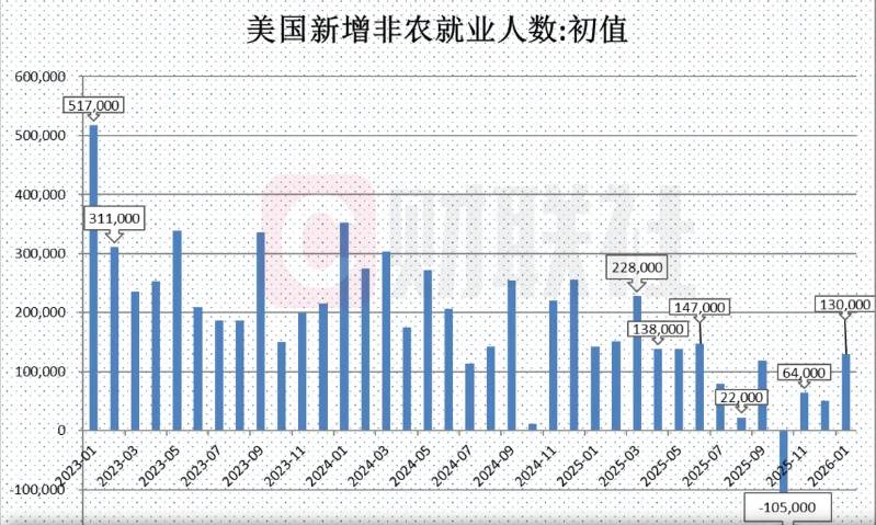 美国1月季调后非农就业人口增加13万人,大幅高于市场预期中值7万人,创2025年4以来最大增幅。