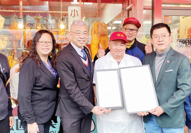 布碌仑州参议员陈学理(Stephen T. Chan)与州众议员郑永佳(Lester Chang),14日为长期捐餐支持抗议羊头湾科伊尔街(Coyle St)游民所计划的两家华人商铺颁发表扬状,感谢两店长期以来对社区的贡