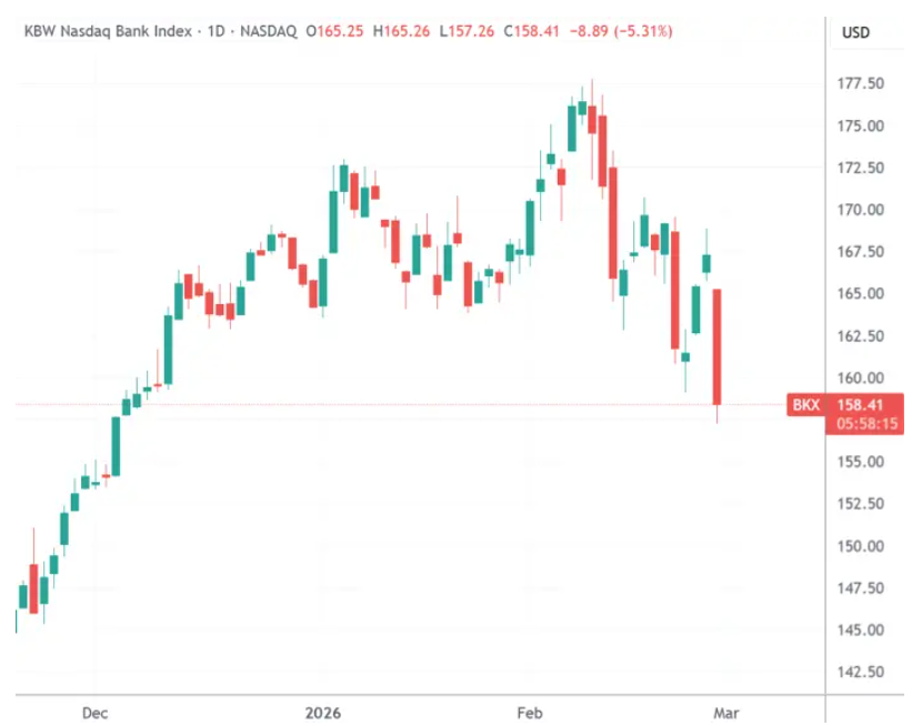 2月28日,美股市场周五开盘后,美国银行、资管和金融服务板块再度遭遇沉重抛售。除了人工智能引发金融系统风险的忧虑外,背靠华尔街支持的英国抵押贷款公司MFS轰然倒闭也引发私