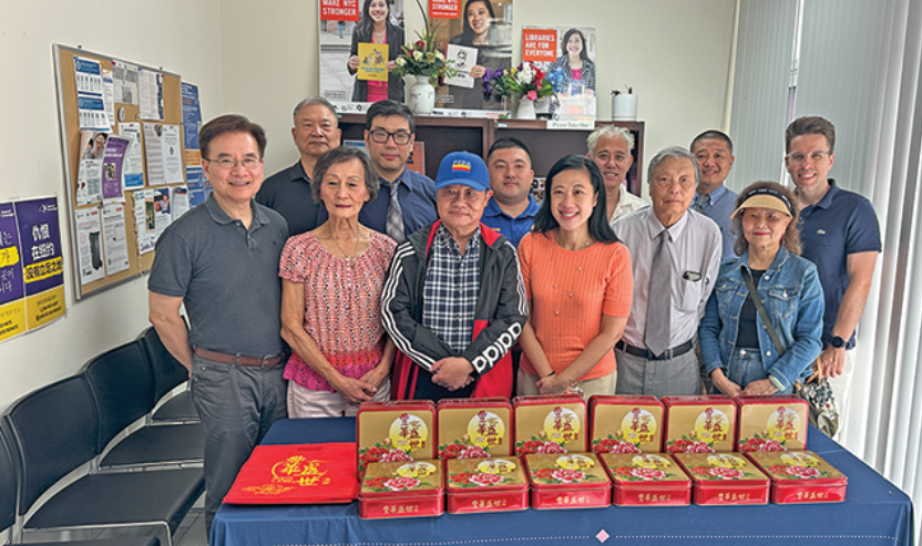 法拉盛华人(工商)促进会联合市议员黄敏仪(Sandra Ung)24日(周三) 为市警109分局及5间老人中心分发月饼。 法拉盛华人(工商)促进会(FCBA)首席顾问杜彼得,新任理事长郑栋焕、华策会福