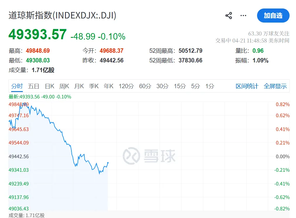 4月21日晚间,美股三大指数早盘走高,截至发稿,直线跳水。