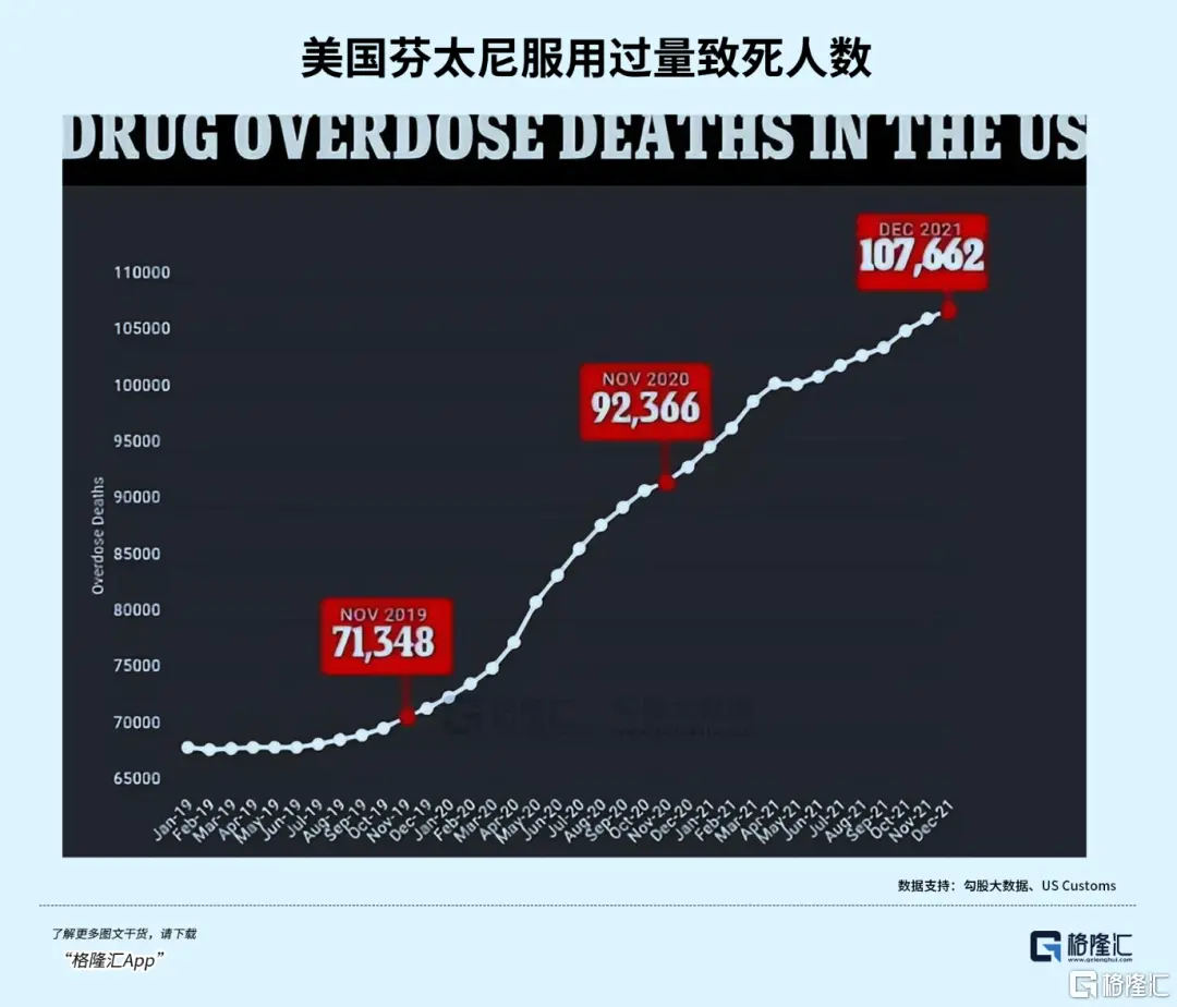 这种药效是吗啡100倍的毒品,致命剂量仅2毫克(约15粒食盐),仅2023年就导致7.4万美国人死亡,超过越战、伊战美军伤亡总和。