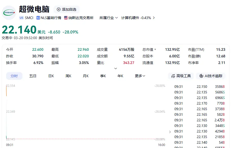 受此消息影响,当地时间3月20日,超微电脑股价开盘暴跌,截至发稿,该股跌超28%。