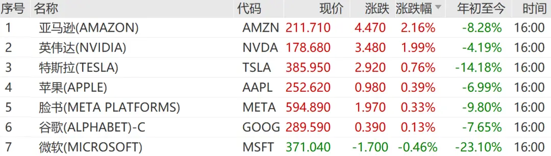 亚马逊涨2.16%,英伟达涨1.99%,特斯拉涨0.76%,领涨美国科技七巨头。