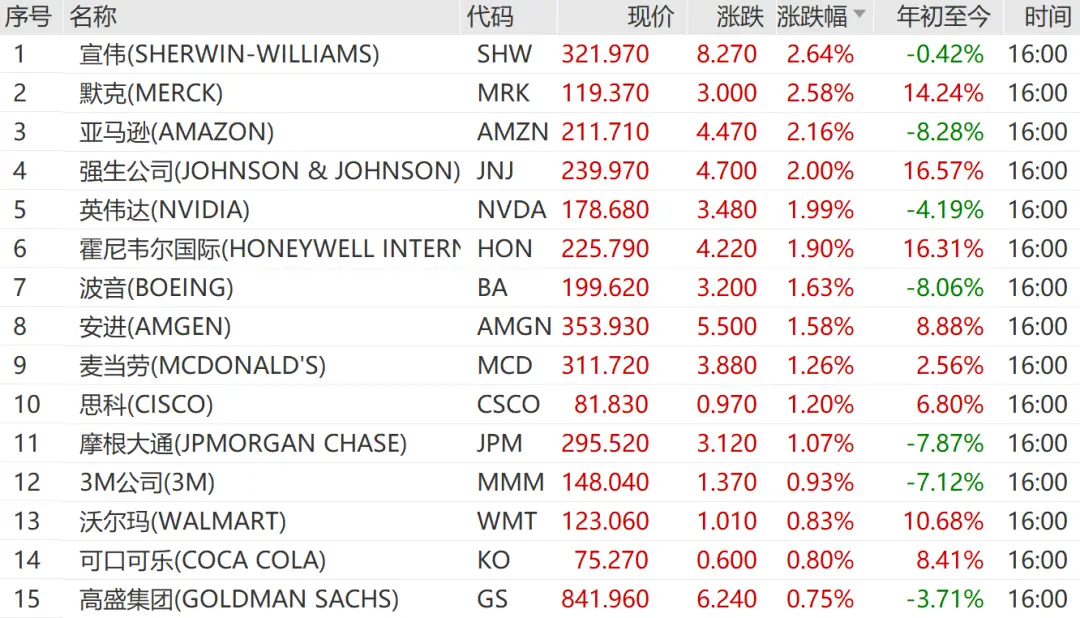 宣伟涨2.64%,默克涨2.58%,亚马逊涨2.16%,领涨道指成份股
