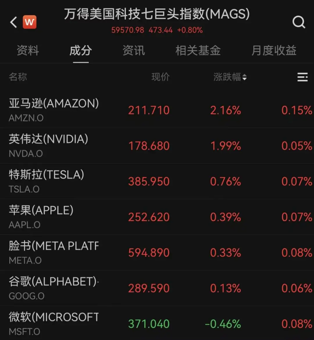 美股大型科技股多数上涨,万得美国科技七巨头指数涨0.80%。其中,亚马逊涨超2%,英伟达涨1.99%,特斯拉、苹果、Meta、谷歌-C涨幅均不超1%;微软跌0.46%。