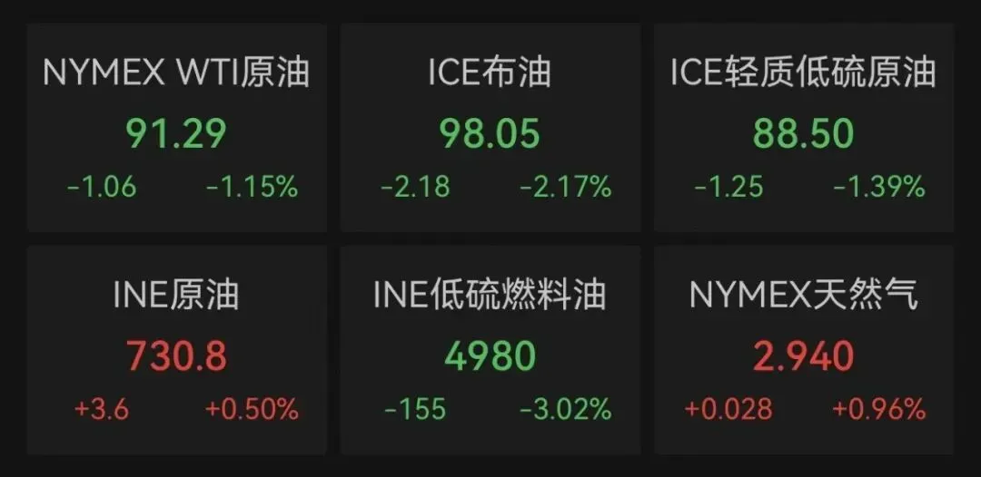 国际原油期货价格小幅回落。截至北京时间3月26日5:30,NYMEX WTI原油期货主力合约下跌1.15%,报91.29美元/桶;ICE布油期货主力合约下跌2.17%,报98.05美元/桶。