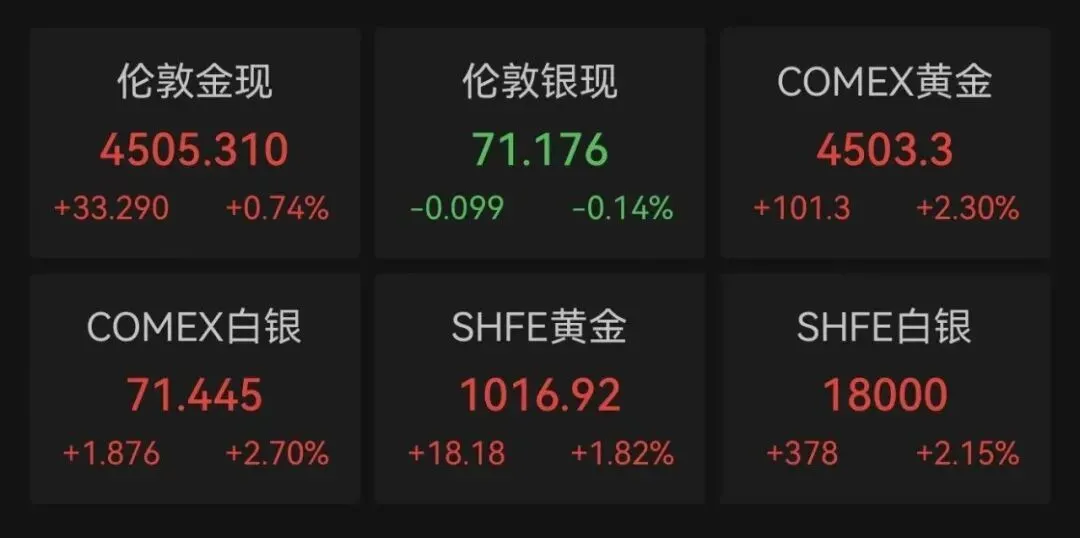 国际贵金属市场回暖。截至北京时间3月26日5:30,伦敦金现货价格上涨0.74%,报4505.310美元/盎司;COMEX黄金期货价格上涨2.30%,报4503.3美元/盎司。伦敦银现货价格下跌0.14%,报71.176美元/盎司;COMEX白银期货价格上涨2.70%,报71.445美元/盎司。