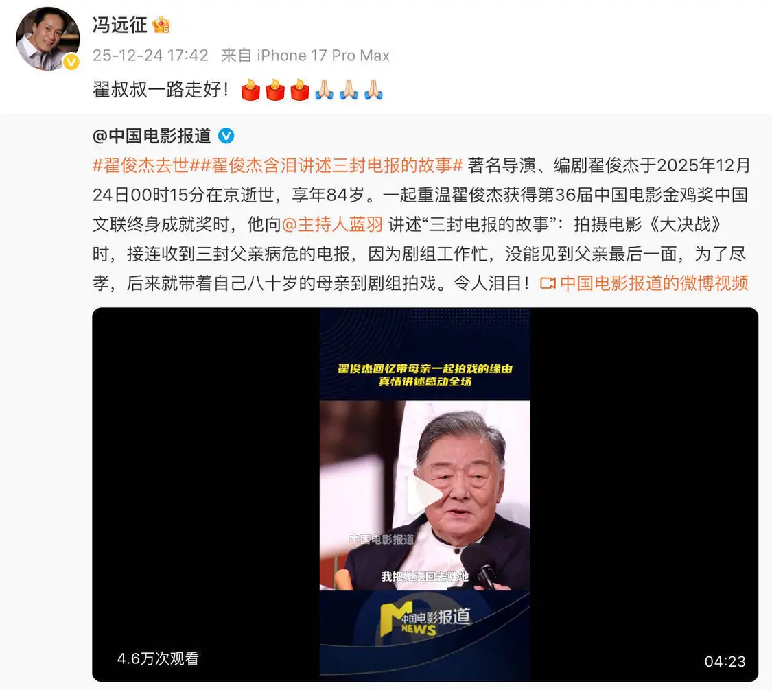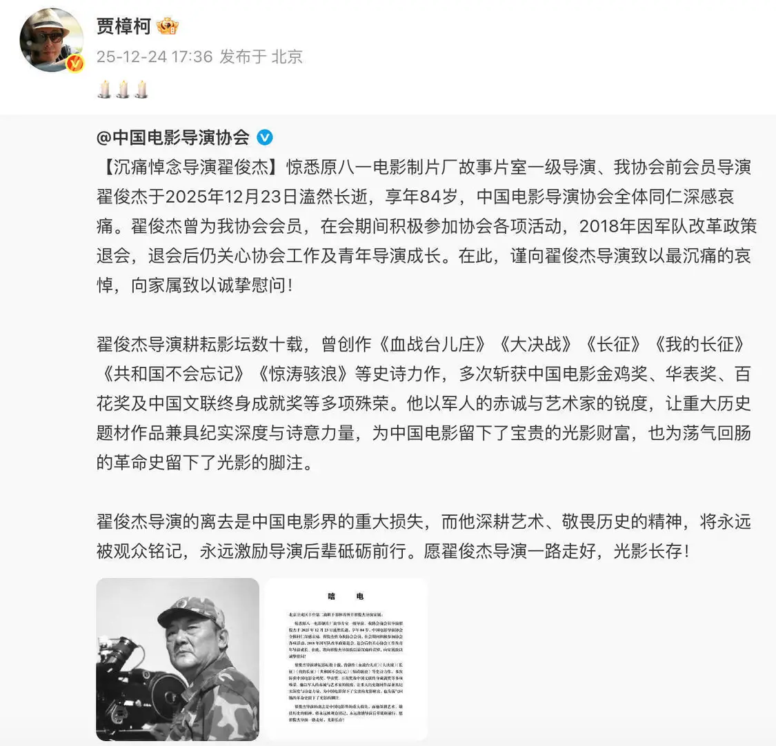 原八一电影制片厂故事片室一级导演翟俊杰,于2025年12月23日与世长辞,享年84岁。贾樟柯、冯远征、蒋勤勤等多位艺人纷纷转发消息,以表悼念之情。