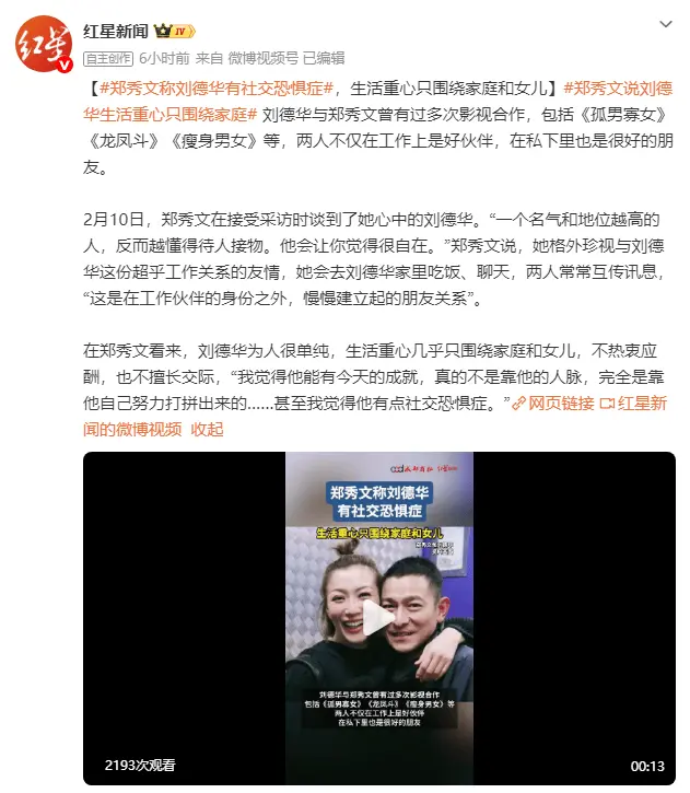 郑秀文还坦言,刘德华为人单纯,生活重心几乎都放在家庭和女儿身上,不喜欢应酬,也不擅长社交。她认为刘德华能取得如今的成就,并非依靠人脉,完全是靠自身努力打拼而来,甚至直言觉得他有些社交恐惧症。