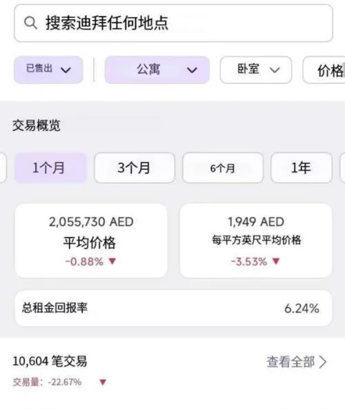 迪拜公寓近一个月成交数据(App截图翻译后) 来源:property monitor