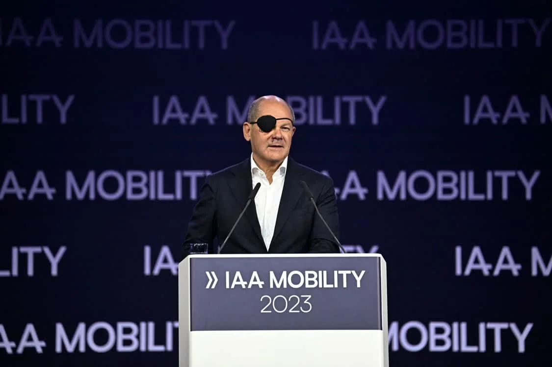 戴着黑色眼罩的朔尔茨出席慕尼黑车展开幕式,图自美媒