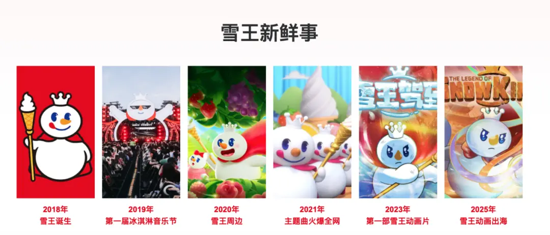 2023年8月,蜜雪冰城推出了以雪王为主角的首部动画《雪王驾到》,此后又推出了《雪王之奇幻沙洲》等原创动漫作品。