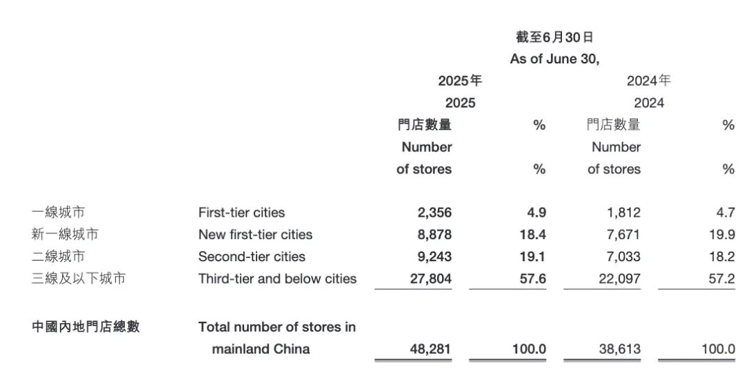 相比之下,一线城市门店仅2356家,占比为4.9%;新一线城市的门店数为8878家,占比为18.4%;二线城市门店达9243家,占比为19.1%。