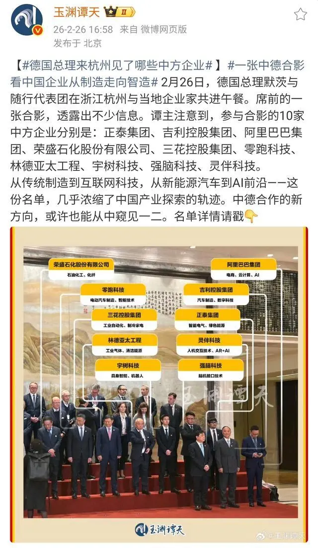 IT之家 2 月 27 日消息,据总台玉渊谭天报道,2 月 26 日,德国总理默茨与随行代表团在浙江杭州与当地企业家共进午餐。席前的一张合影,透露出不少信息。