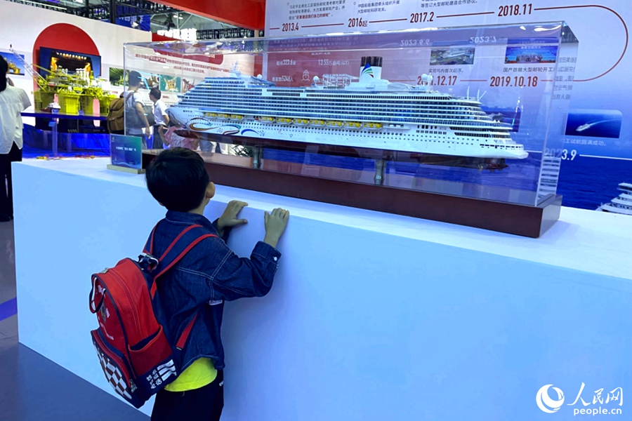 展馆内,小朋友正端详游轮模型。人民网记者 林盈摄