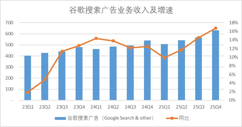 四季度谷歌搜索广告营收录得630.73亿美元,高基数下同比增长16.7%,是表现最为出色的业务之一。