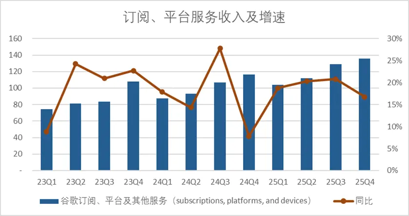 谷歌四季度订阅级平台服务收入录得136亿美元,在高基数下增长16.7%。