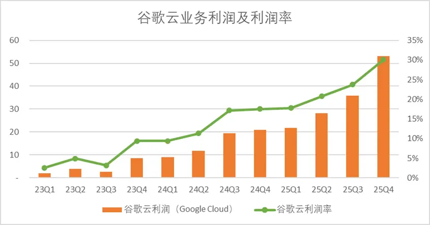 不仅仅是营收侧高奏凯歌,利润侧谷歌云的表现同样不俗,去年四季度拆分后的谷歌云利润达到了53亿美元,利润率直接突破了30%,很明显谷歌云已经不是简单的硬件生意。