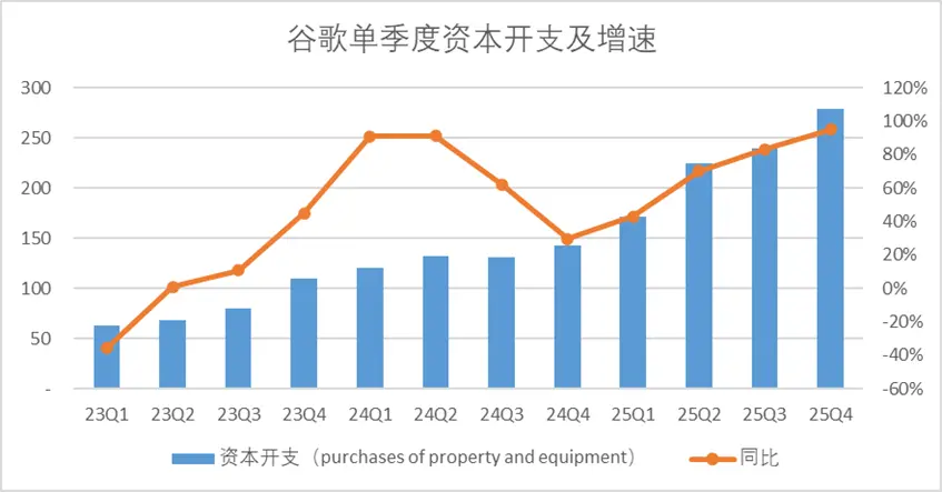 同时,四季度谷歌的资本开支录得278.5亿美元,高基数下同比再增95%,全年资本开支接近915亿,落在了三季度指引的下位区间。