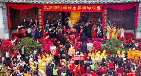 中新社福建湄洲岛2月24日电 (郑江洛)妈祖赐福,欢庆元宵莆台同胞护驾妈祖金身回上林故居省亲布福活动24日在福建莆田湄洲岛启幕,两岸妈祖信众同谒妈祖、共祈平安,以民俗为媒,