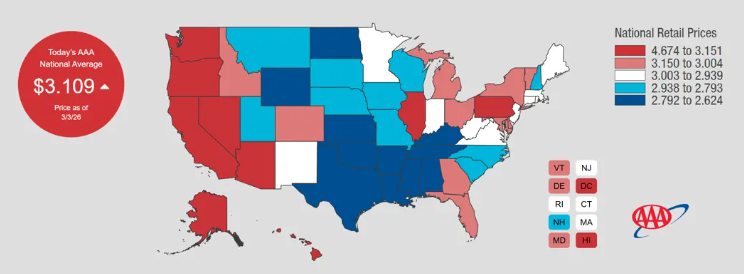 3月4日,美东时间周二,随着中东地区战争加剧,原油价格持续飙升,美国加油站的汽油价格已经大幅上涨,仅用两天时间就从每加仑约2.9美元上涨至3.1美元以上。 根据美国汽车协会(