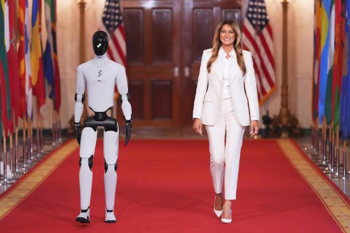 周三,一位特殊的客人加入了第一夫人梅兰妮特朗普的行列:一个会走路、会说话的人形机器人。 这个闪亮的黑白机器人名为Figure 03,与特朗普夫人肩并肩漫步进入东厅,参加她的国际