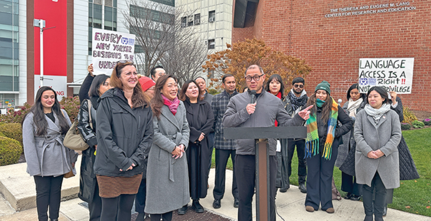 州众议员李罗莎(Nily Rozic)联合州参议员刘醇逸(John Liu)12日于皇后区法拉盛纽约长老会皇后医院外举行集会,呼吁州长霍楚签署由他们二人提出的《医院语言协助法案》(A387/S6288)