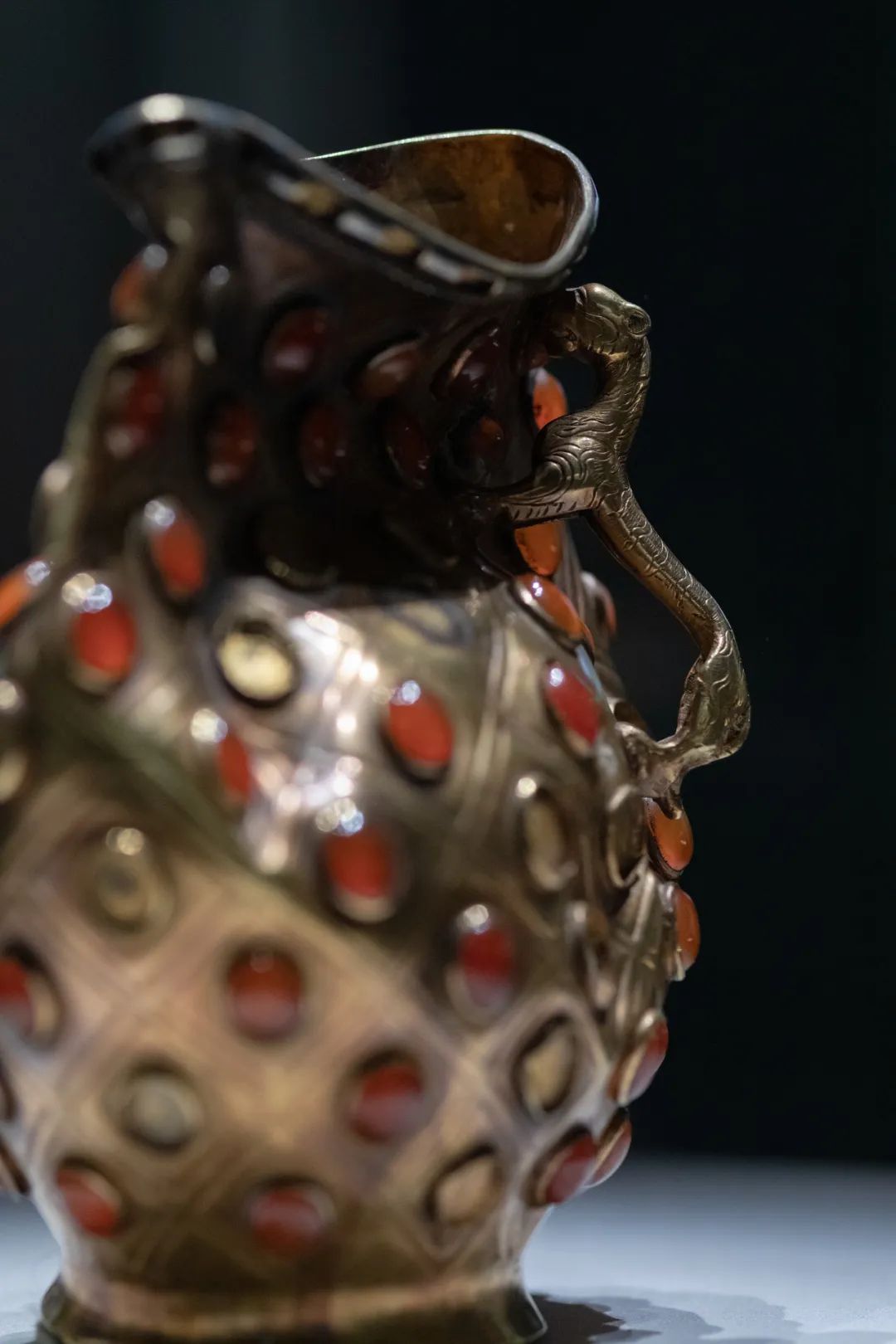 镶嵌红玛瑙虎柄金杯,北朝,伊犁哈萨克自治州博物馆藏