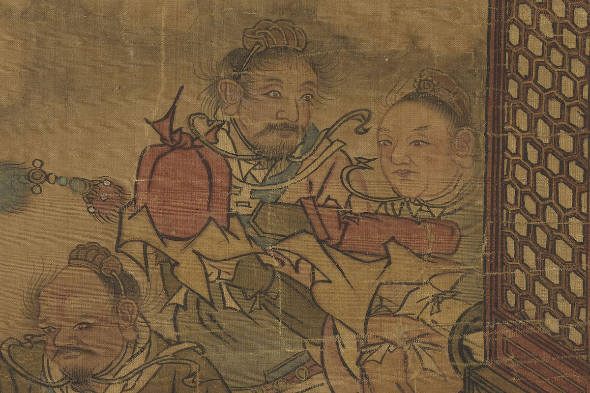 《三官出巡图》用水墨与金彩在巨幅绢帛上,画出合称“三官”的天官、地官、水官出巡的盛大场面。信徒相信,三位道教神明会定期到各自管辖的天、地、水三界出巡,以考察善恶、判定祸福,角色好比人间的海陆空司令及法官。