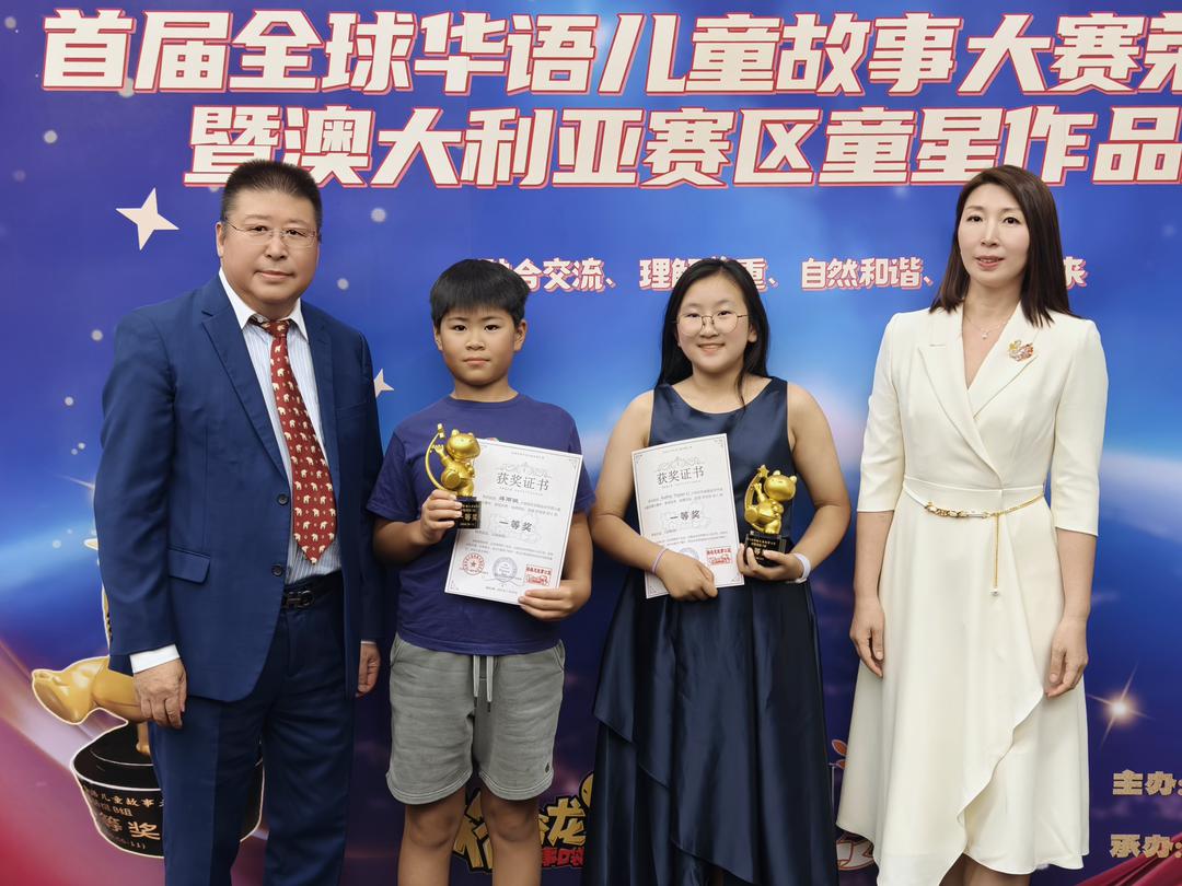 澳大利亚国际文化产业协会主席为C 组一等奖获得者:蒋雨骏, Audery Yiqian LI 两位小朋友颁奖,常务副杨洋陪同颁奖
