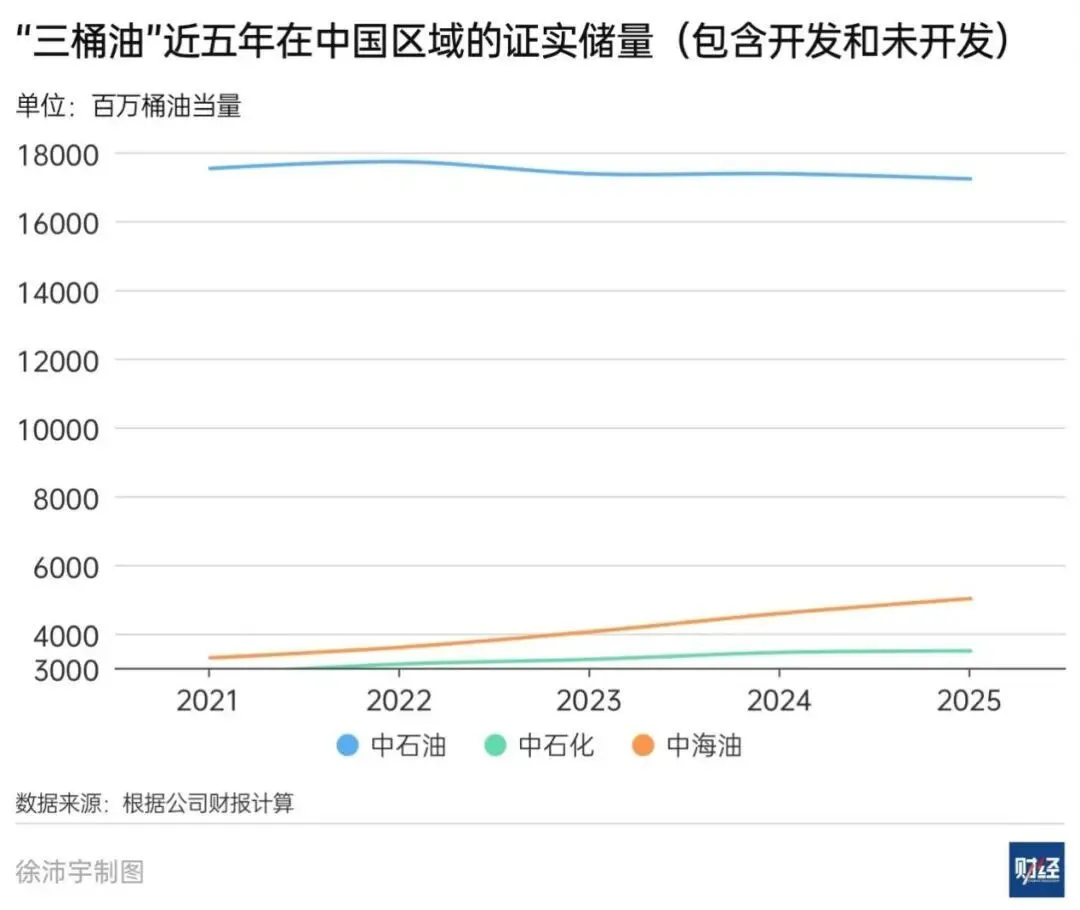 在中国的证实储量方面,“三桶油”表现不一。中石油的证实储量(包括已开发和未开发,下同)从2021年的175.29亿桶油当量,增长到2022年的177.23亿桶油当量。2023年至2025年连续下降至172.24亿桶油当量。