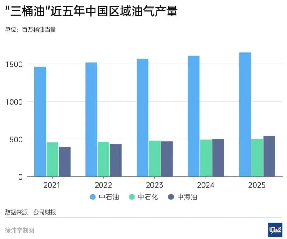 中石油、中海油和中石化三大石油央企(俗称“三桶油”)是增储上产的主力军。综合“三桶油”2025年财报和相关部门披露的数据,据《财经》估算,2025年中石油的油气产量约占全国的一半,中海油和中石化各自均占比超过15%。