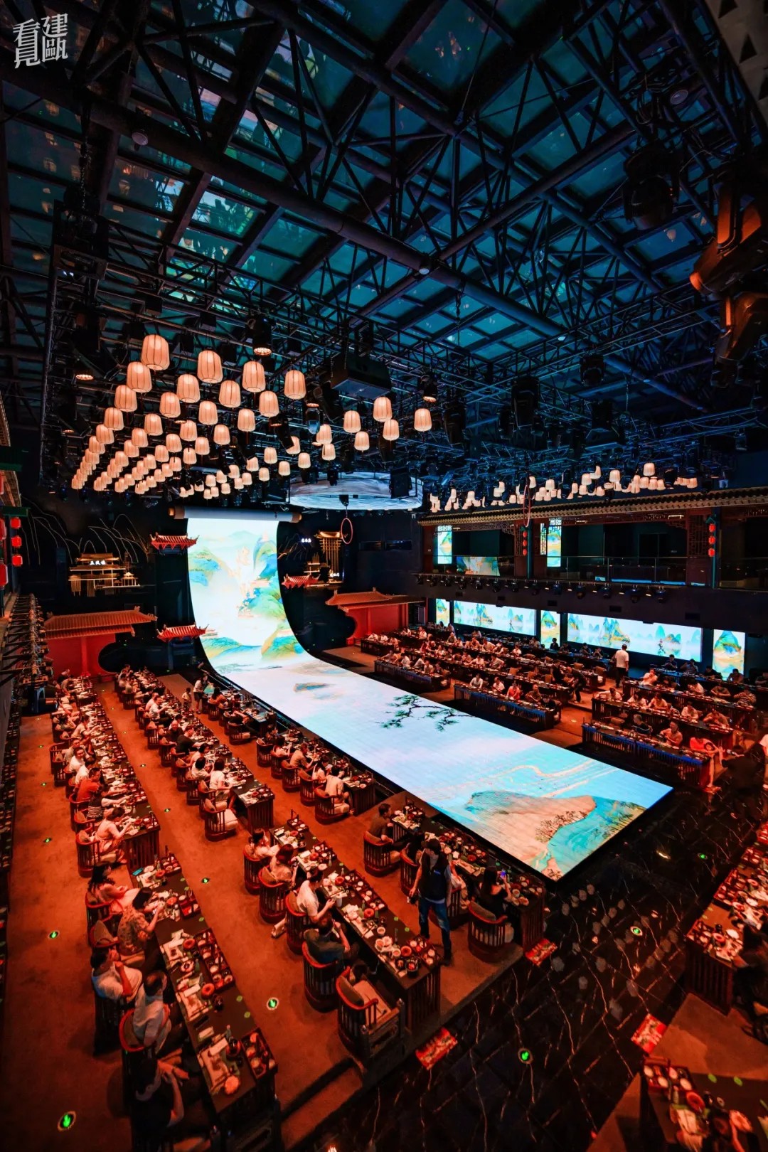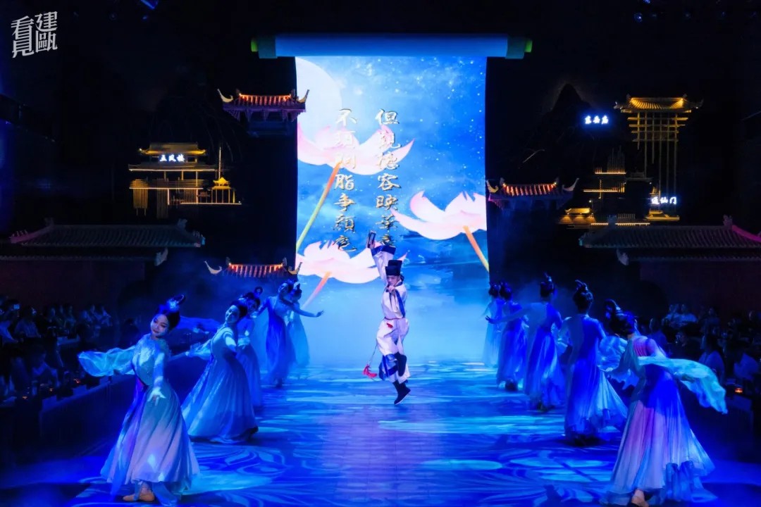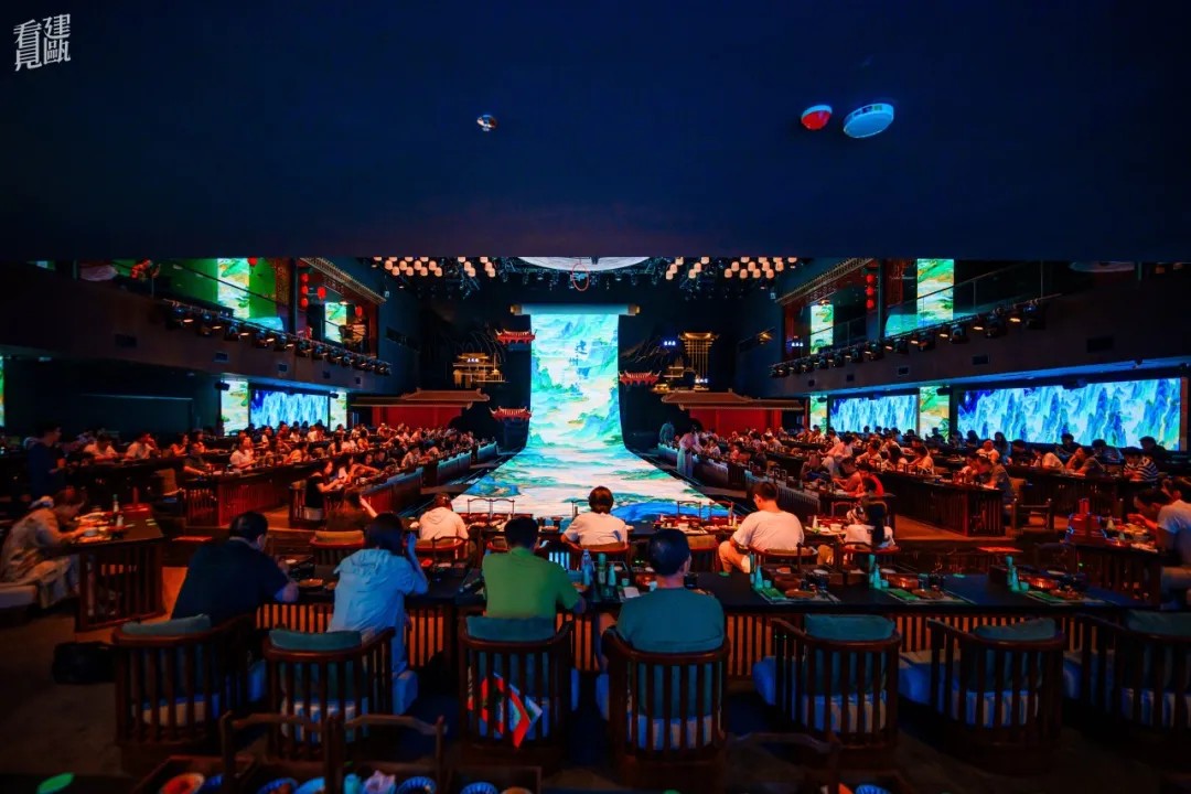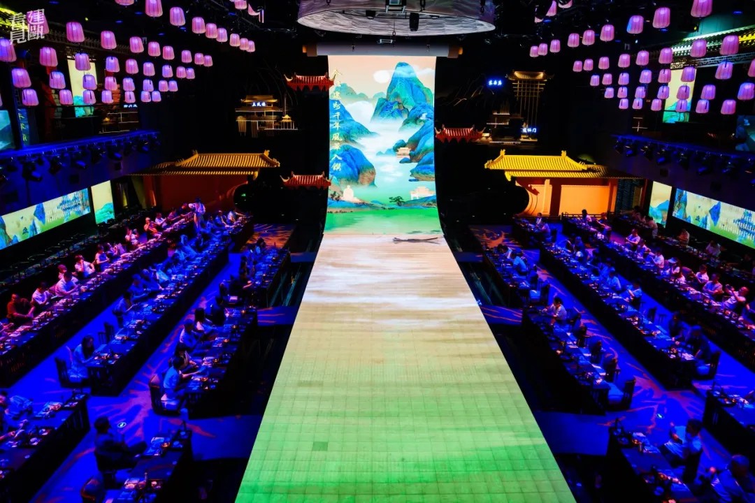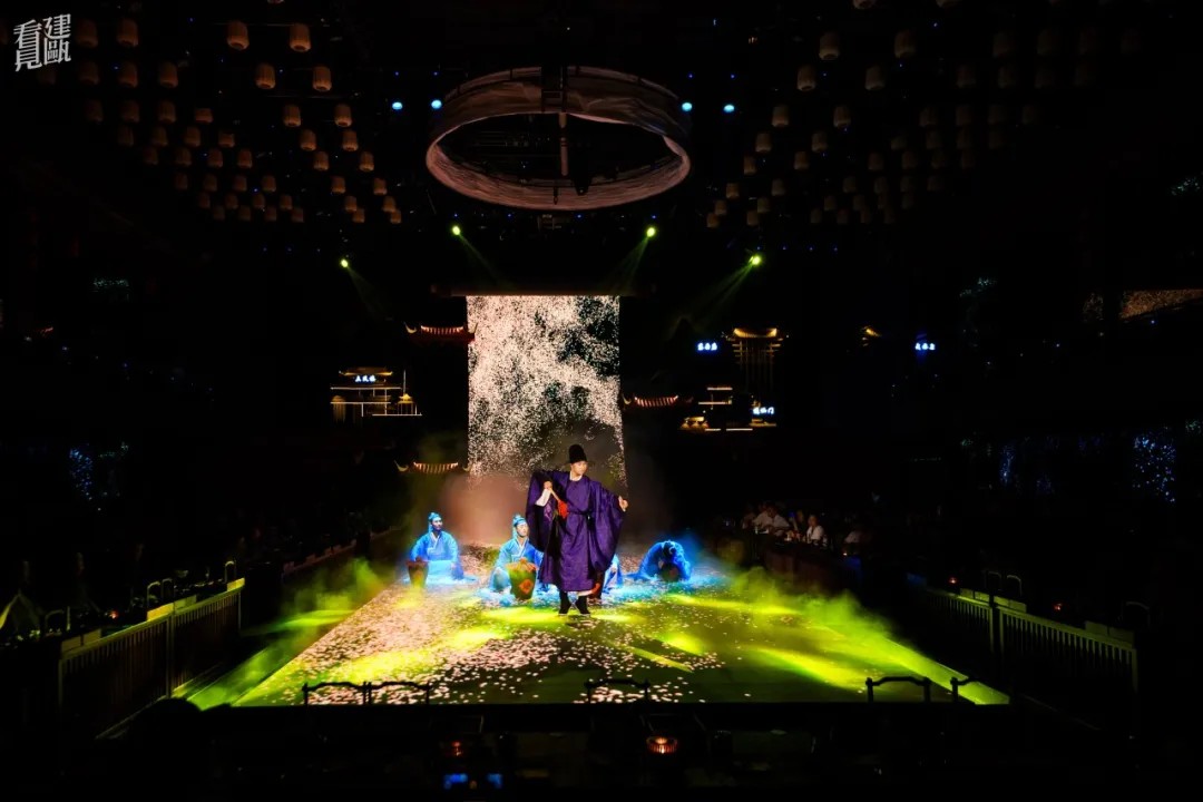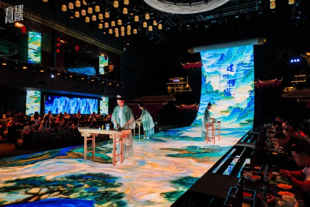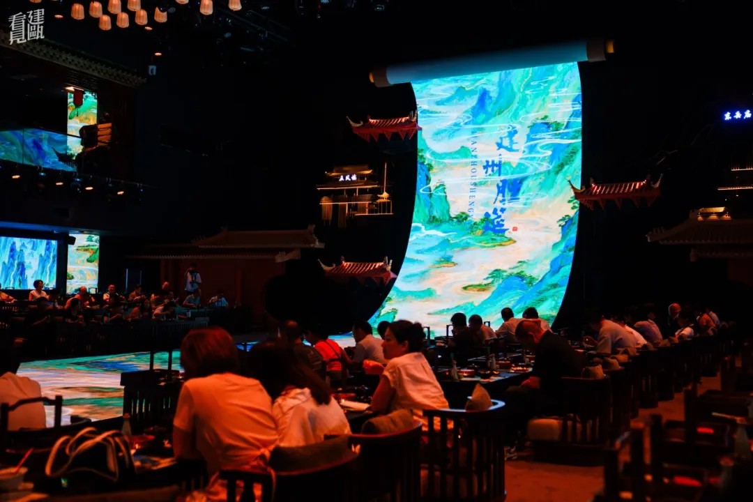 步入展演空间,28.8米的巨幕LED瞬间将你拉入《清明上河图》般的宋代建州盛景。餐秀以南宋美学空间和二十四节气为引,通过春生、夏华、秋思、冬溯四幕剧,重现千年建州古城风韵。