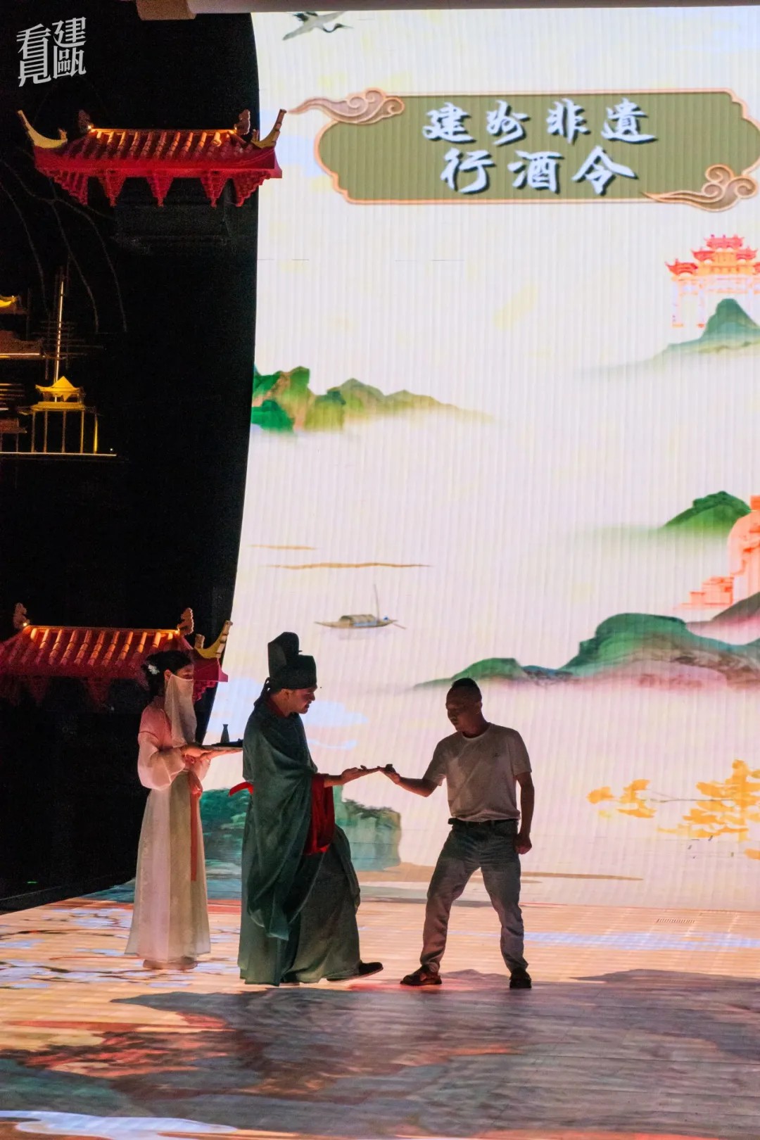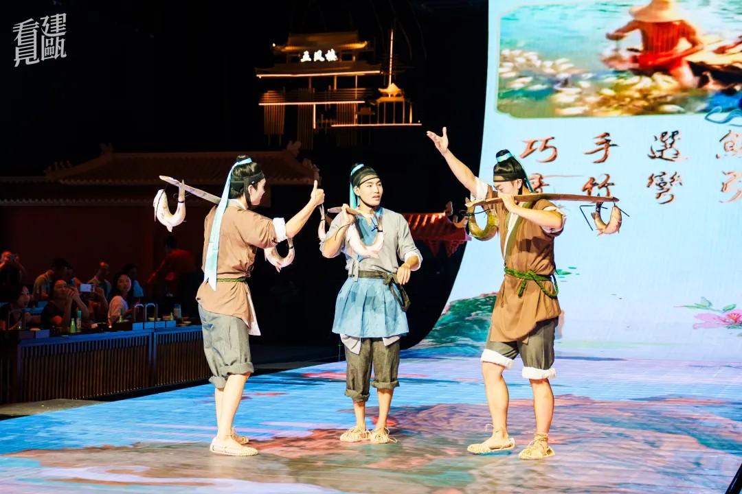 精心设计的服饰、舞蹈和多媒体互动,展现建州的地域特色和季节变换的自然之美。表演还深度融合了弓鱼技艺、建州酒令、唱曲子、北苑点茶等建瓯非遗文化,让沉睡千年的文化遗产在餐桌上“活”起来。