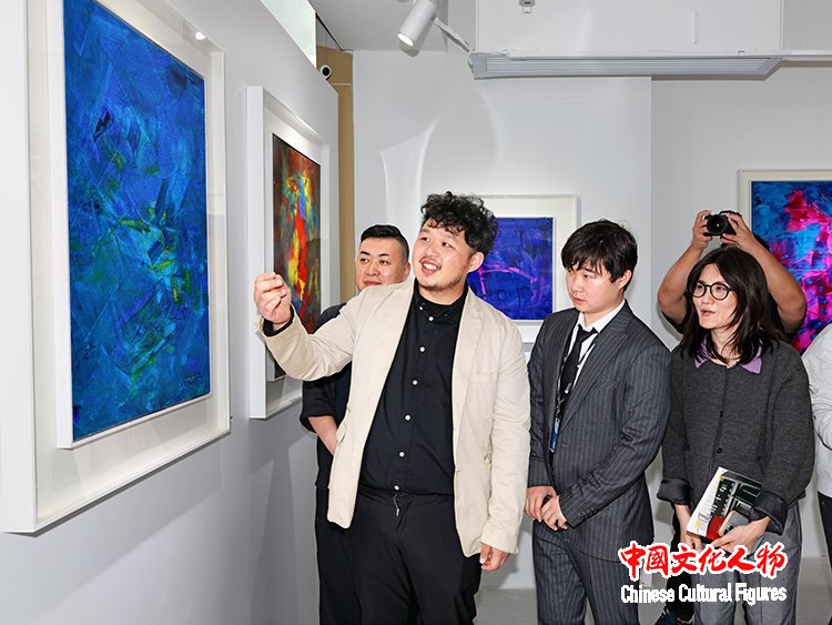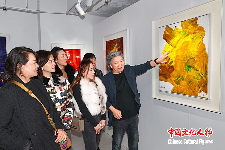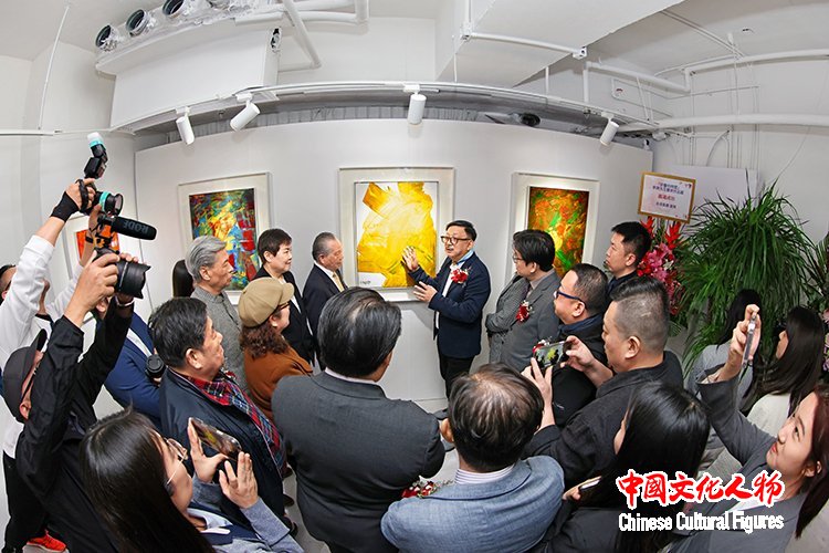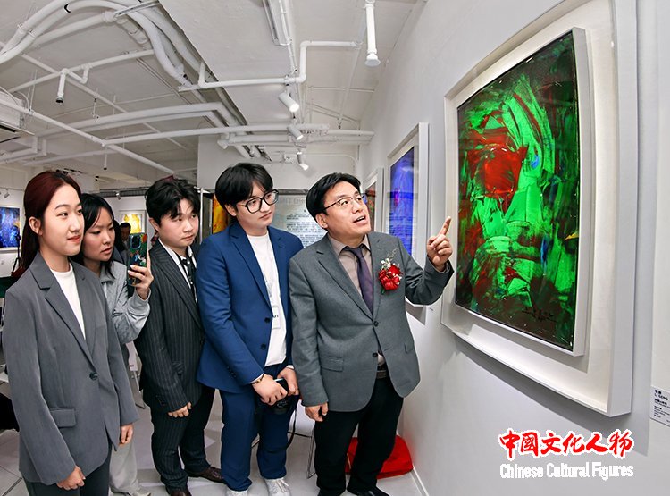 中国文化人物杂志社社长王保胜为香港著名艺术家何百里等艺术家嘉宾讲解展览作品