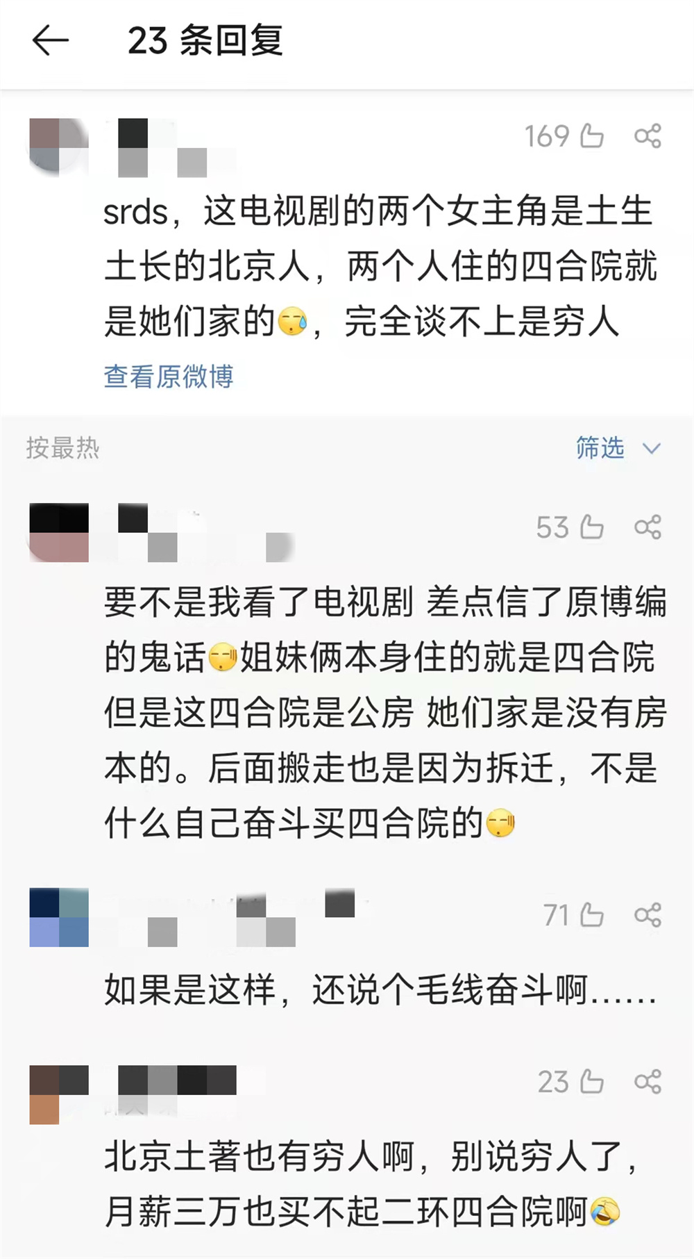 帖子的每一句都精准踩在打工人的心尖上, “穷人”“打工几年”“北二环旁边买四合院”,只要拿出手机查一查北京房价,再看看自己每个月的到账工资短信,一定会认为编剧在漫天瞎写。