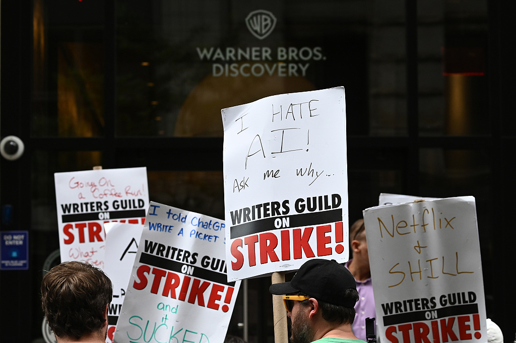 当地时间2023年7月13日,美国纽约,美国东部编剧协会成员手持标语,与美国演员工会成员一起在华纳兄弟的公司外抗议。